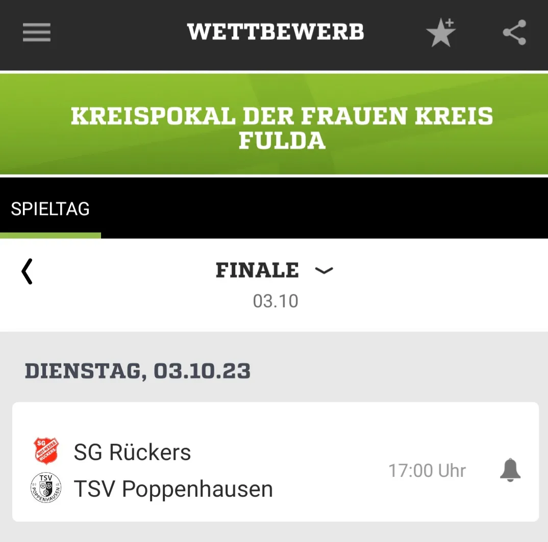 Am Dienstag, den 03.10.2023 findet das diesjährige Kreispokalendspiel der Frauen statt. Gegner unserer Frauen ist dabei wie schon in den letzten Jahren erneut Verbandsligist TSV Poppenhausen. Das Spiel wird um 17:00 Uhr in Rückers im Anschluss an das Gemeindederby der Herren in der Kreisoberliga gegen die SG Magdlos angepfiffen. Unsere Frauen würden sich sehr über zahlreiche Unterstützung freuen. Der Sieger des Spiels trifft dann am 11.11. im Hessenpokal auf Hessenligist TSG Lütter I