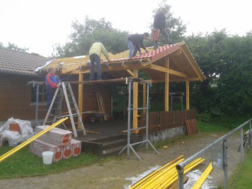 Bei der SG Rot-Weiß Rückers läuft das anders. Da zur Zeit wegen eines anderen laufenden Objekts keine Zuschüsse beantragt werden können, nahm kürzlich ein Teil der Mitglieder das Heft des Handelns selbst in die Hand, um buchstäblich nicht länger im Regen stehen zu müssen. Die treuen Anhänger, die bei jedem Heimspiel in ihrer "Südkurve" stehen und die Mannschaften unterstützen, setzten eine fixe Idee kurzerhand in die Tat um: Eine Tribünenüberdachung wurde von der Planung über die Finanzierung bis zur Fertigstellung in Eigenregie realisiert.